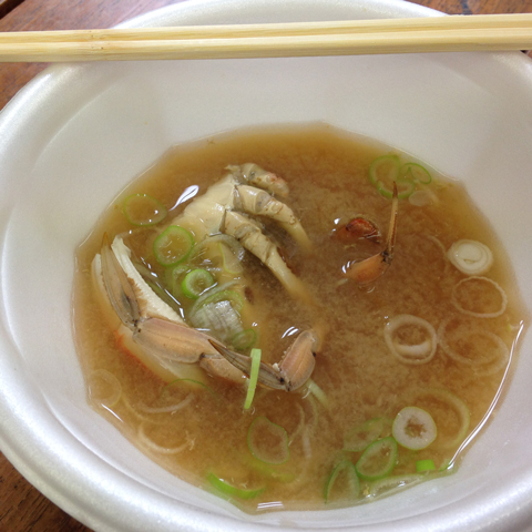 そして、福島のものは美味しいという事を確認して欲しいと振る舞われたのが「ひらつめガニの味噌汁」シンプルなだけに素材が命。カニのだし、たまりませんでした!ごちそうさま 🙂