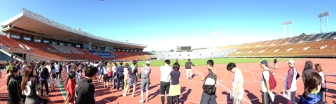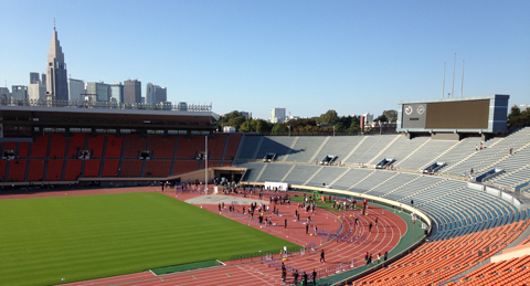 来年にはこの競技場も取りこわしが始まり、数年後あの未来的なスタジアムに変わります。まだまだ現役で使えそうなだけに勿体ない。ここは残し、必要なら別の場所に建設すれば良いのにとも思います。建て替えるにしても、東京駅やKITTEになった東京中央郵便局のように、どこかにこの競技場の一部を残せたらいいのにと、この場所で汗をかきながら思った秋晴れの日でした。