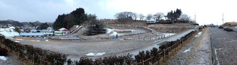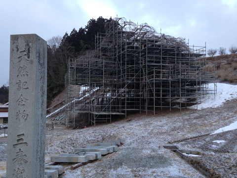 早朝、ここを訪れる手前で見た気温表示がマイナス6度でした。風が吹く度に極薄く積もった雪がぱーっと舞い上がり何処かへと飛ばされていきます。広場の中央には足場が組まれ、その中に春を待つ樹木があります。三春の滝桜です。