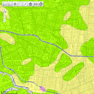詳細に色分けされています。下は、当社近辺の液状化地図です。横切っている黒い線が神田川、左下が日本橋川です。緑が液状化の可能性が低いところです。さすがに本郷台地は可能性が低いようです。ピンク色は可能性が高いとされたところです。