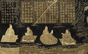 また「蘭亭図巻」も面白かったです。川の上流から杯を流し、飲んで一首詠むといういわゆる曲水の宴の様子を描いたものです。永和9年(西暦353年)に蘭亭で開かれたこの宴を蘭亭序としてまとめたのが主催者の王羲之です。これが、太宗皇帝が摸本を造って広がり、明の時代にその蘭亭序を元に、絵巻物のようにまとめられた作品です。ちなみに、王羲之さんは、右から2番目です。