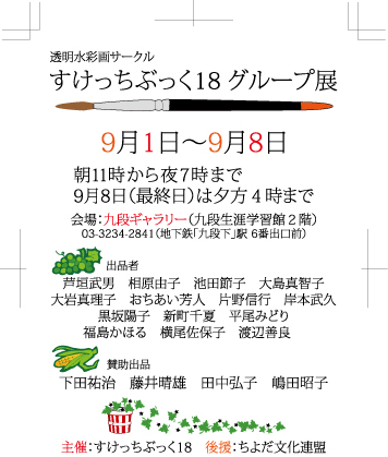 9月1日(日)から8日(日)まで、九段生涯学習館の2階ギャラリーにて、透明水彩画サークル「すけっちぶっく18」のグループ展が開かれます。このサークルでは4人の講師が順番に指導を受けているお陰で、メンバーそれぞれの個性が発揮された画風を楽しめると思います。どうぞお運び下さいませ。私も数点出品しています。うち一番小さな作品だけご紹介させていただきます。会社裏手から見た聖橋です。